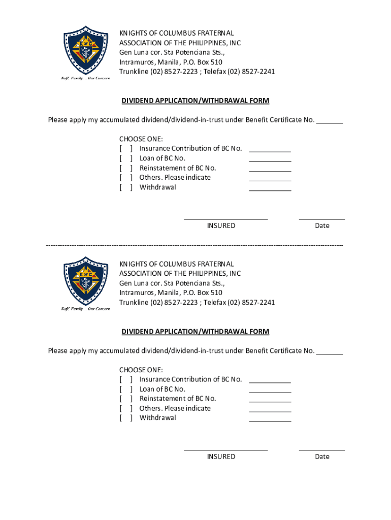 KNIGHTS OF COLUMBUS FRATERNAL ASSOCIATION OF THE PHILIPPINES, INC Gen Luna cor. Sta Poinciana St's., Intramural, Manila, P.O. Box 510 Trunk line (02) 85272223 ; Telefax (02) 85272241DIVIDEND APPLICATION/WITHDRAWAL