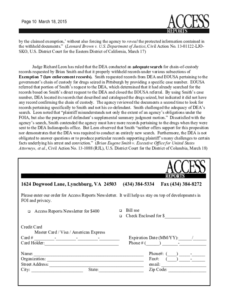 Volume 41, Number 6 March 18, 2015A Journal of News & Developments, Opinion & Analysis In this Issue Clinton Emails Raise Questions About Agency Record Obligations............. 1 Views from the States