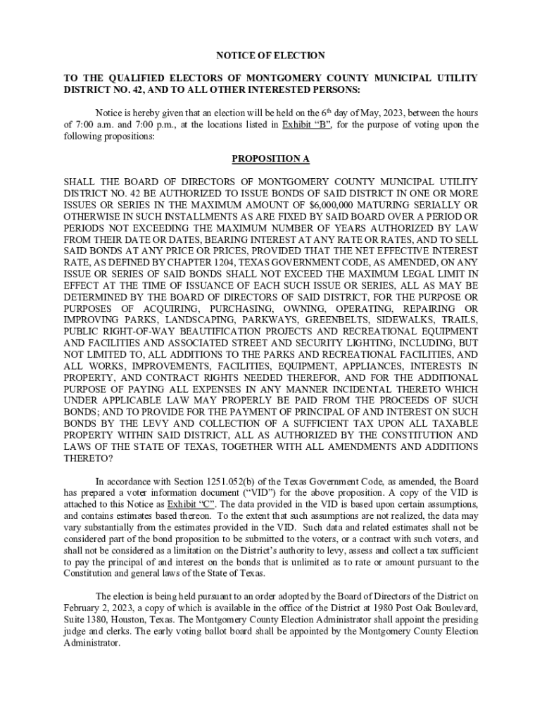 NOTICE OF ELECTION TO THE QUALIFIED ELECTORS OF MONTGOMERY COUNTY MUNICIPAL UTILITY DISTRICT NO. 42, AND TO ALL OTHER INTERESTED PERSONS: Notice is hereby given that an election will be held on the