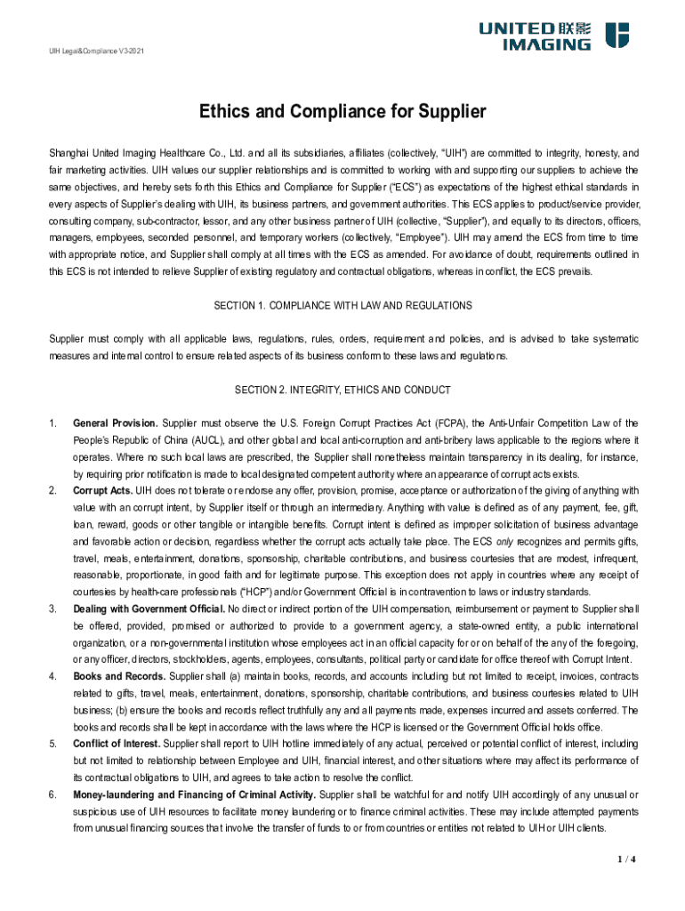 IH Legal&Compliance V32021Ethics and Compliance for Supplier Shanghai United Imaging Healthcare Co., Ltd. and all its subsidiaries, affiliates (collectively, IH) are committed to integrity, honesty,
