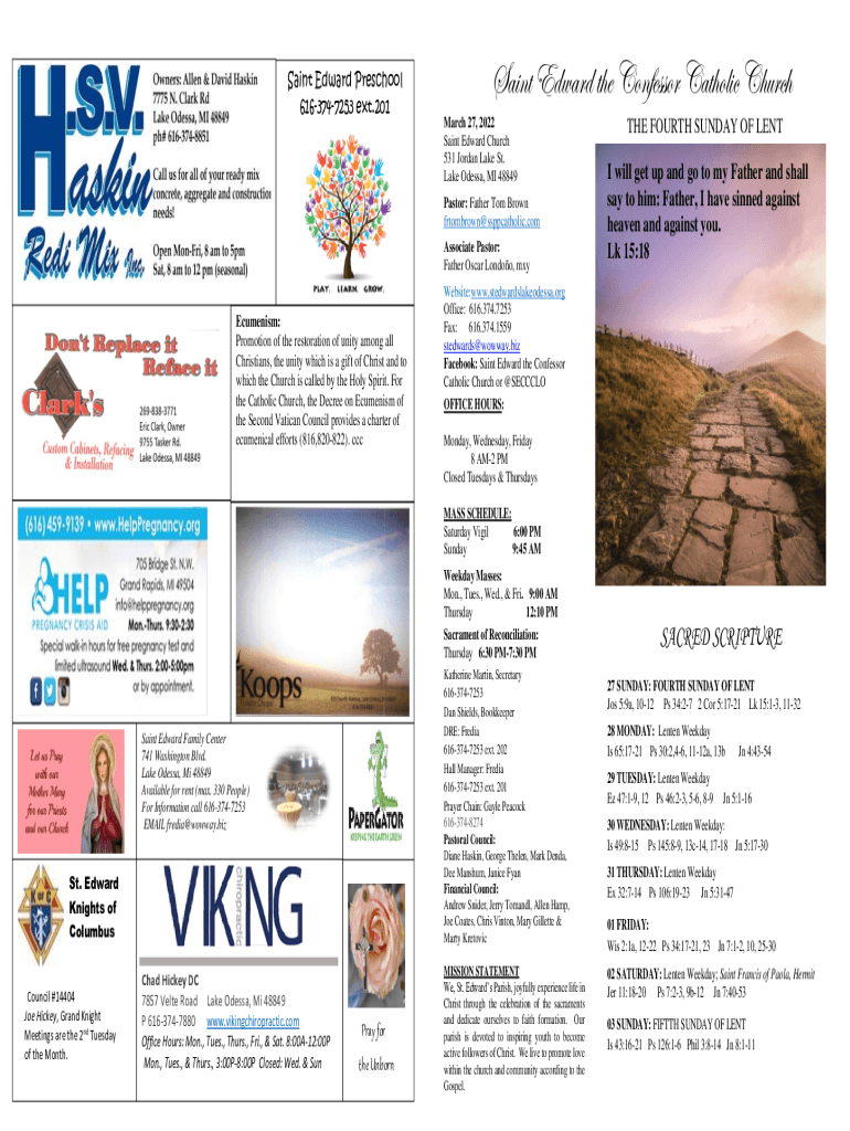 Saint Edward Preschool 6163747253 ext.201FOURTH SUNDAY OF ADVEN1Saint Edward the Confessor Catholic Church March 27, 2022, Saint Edward Church 531 Jordan Lake St. Lake Odessa, MI 48849 Pastor: Father