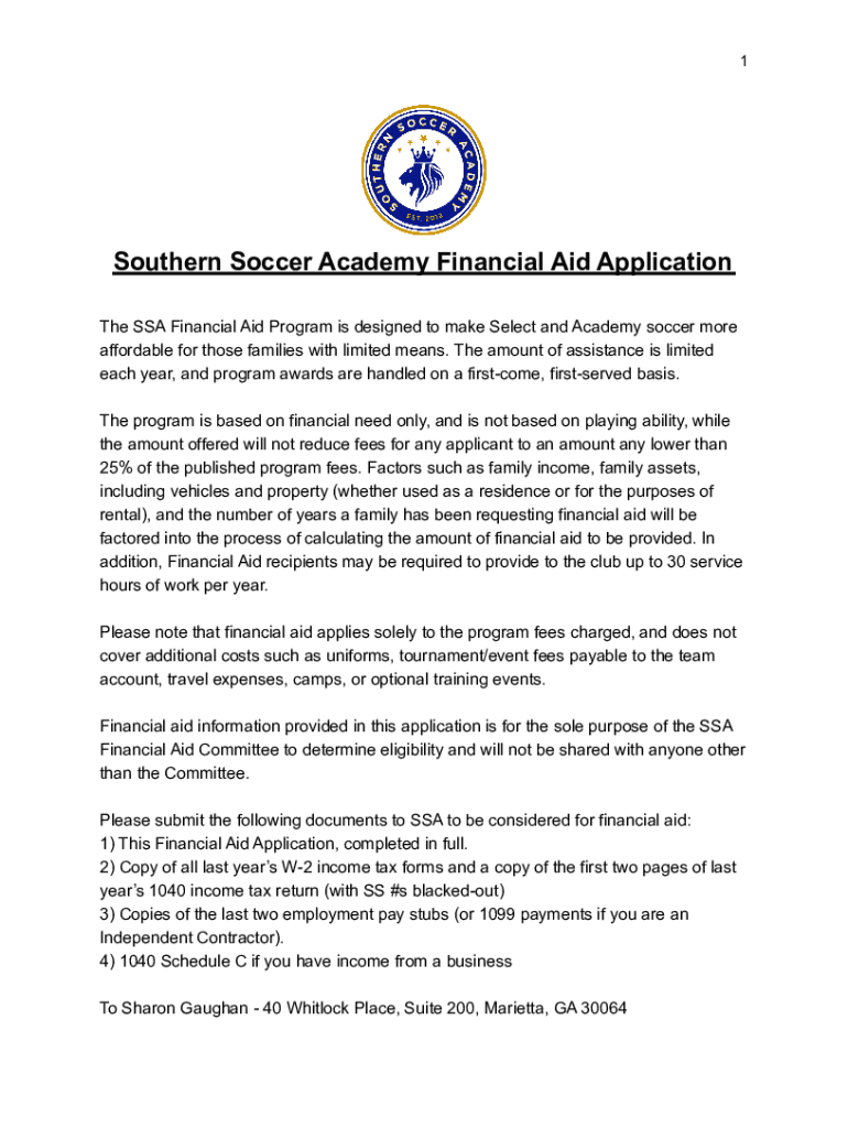 1Southern Soccer Academy Financial Aid Application The SSA Financial Aid Program is designed to make Select and Academy soccer more affordable for those families with limited means. The amount of