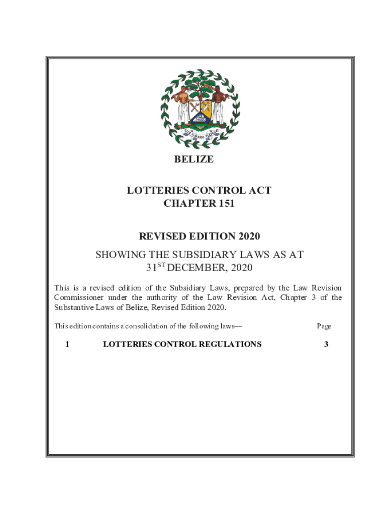 BELIZE LOTTERIES CONTROL ACT CHAPTER 151 REVISED EDITION 2020 SHOWING THE SUBSIDIARY LAWS AS AT 31ST DECEMBER 2020 This is a revised edition of the Subsidiary Laws, prepared by the Law Revision Commissioner