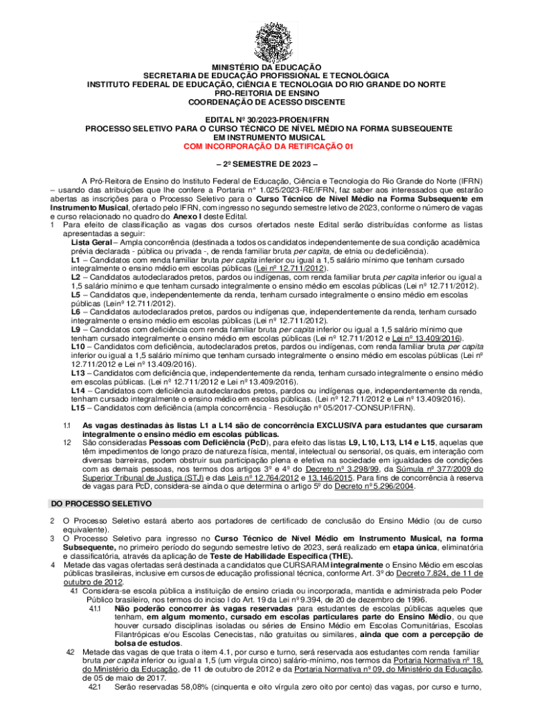 MINISTRY DA EDUC AO SECRETARIAT DE EDUC AO PROFESSIONAL E TECHNOLOGICAL INSTITUTE FEDERAL DE EDUC AO, INDIA E TECHNOLOGY DO RIO GRANDE DO NORTE PRETORIA DE ENSI NO COORDINATE DE ACE SSO DESCENT EDIT