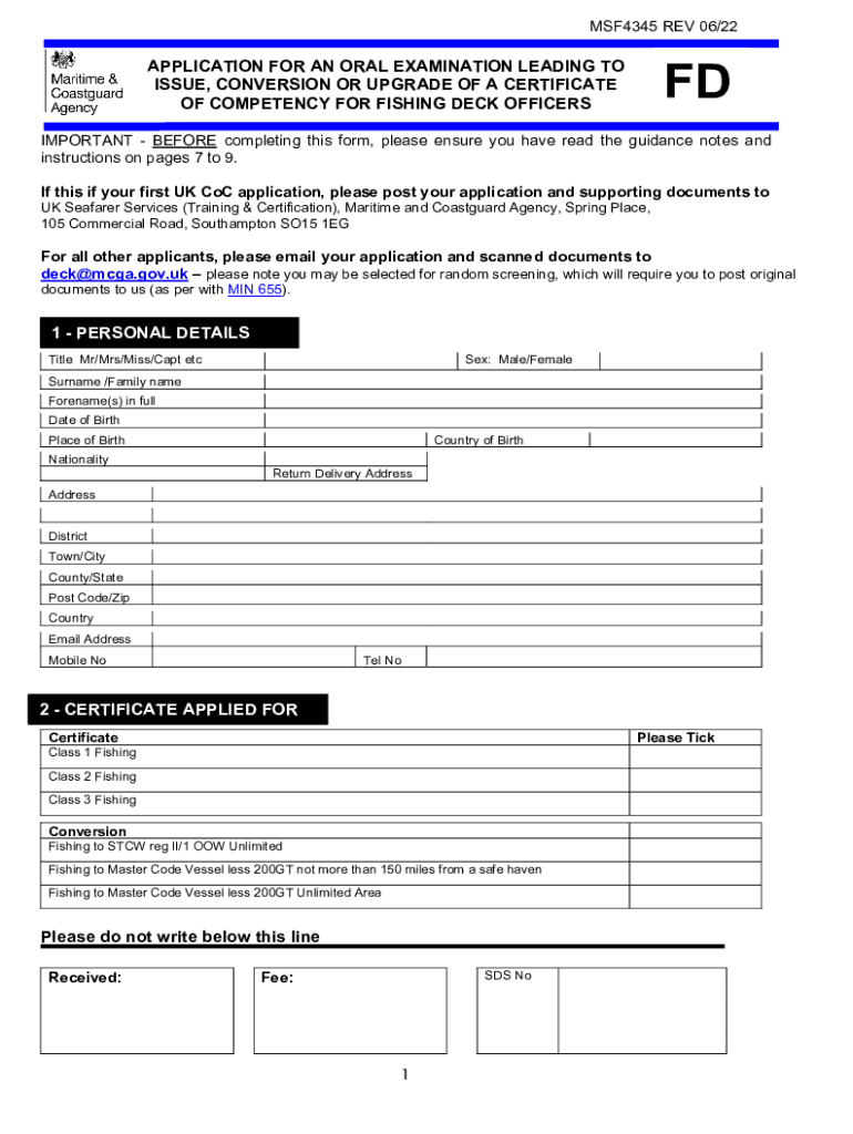 MSF4345 REV 06/22FDAPPLICATION FOR AN ORAL EXAMINATION LEADING TO ISSUE, CONVERSION OR UPGRADE OF A CERTIFICATE OF COMPETENCY FOR FISHING DECK OFFICERSIMPORTANT BEFORE completing this form, please