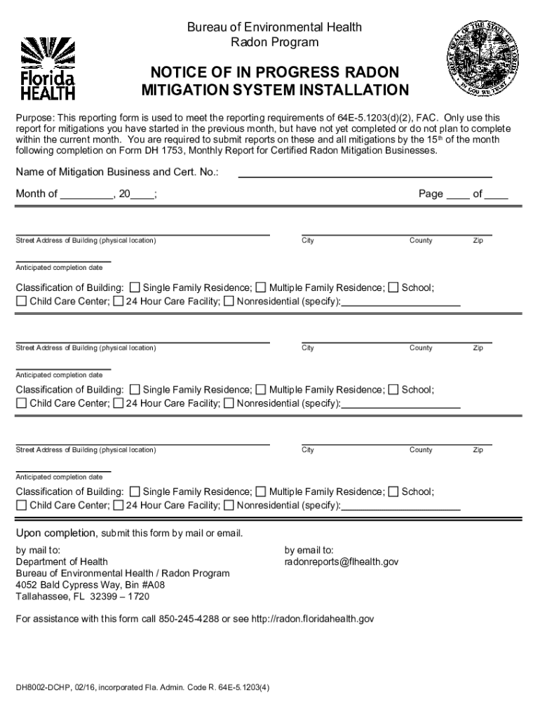 Bureau of Environmental Health Radon Programmatic OF IN PROGRESS RADON MITIGATION SYSTEM INSTALLATION Purpose: This reporting form is used to meet the reporting requirements of 64E5.1203(d)(2), FAC.