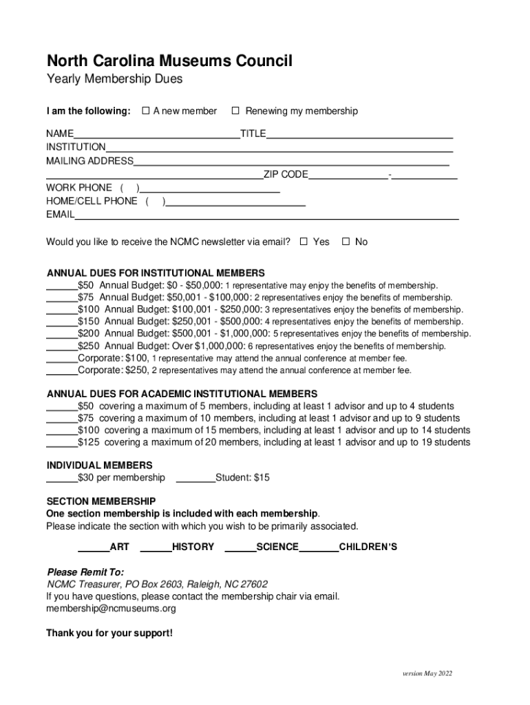 North Carolina Museums Council Yearly Membership Dues I am the following: A new member NAME INSTITUTION MAILING ADDRESSRenewing my membership TITLE ZIP CODE WORK PHONE () HOME/CELL PHONE (EMAIL)Would