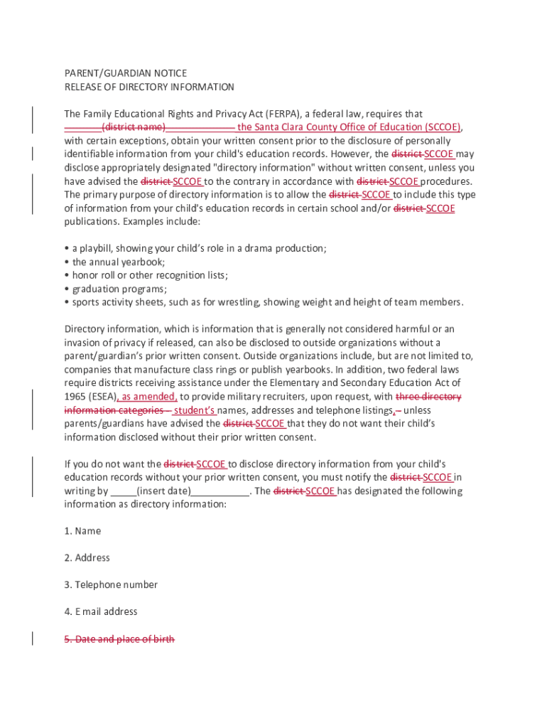 PARENT/GUARDIAN NOTICE RELEASE OF DIRECTORY INFORMATION The Family Educational Rights and Privacy Act (FER PA), a federal law, requires that ___(district name)___ the Santa Clara County Office of