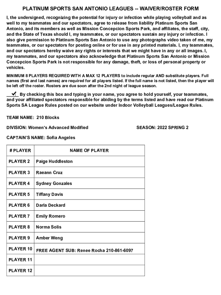 PLATINUM SPORTS SAN ANTONIO LEAGUES WAIVER/ROSTER FORM I, the undersigned, recognizing the potential for injury or infection while playing volleyball and as well to my teammates and our spectators,