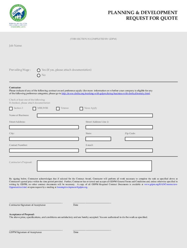 PLANNING & DEVELOPMENT REQUEST FOR QUOTE(THIS SECTION IS COMPLETED BY GDP)Job Name:Prevailing Wage :Yes (If yes, please attach documentation) Contractor: Please indicate if any of the following contract