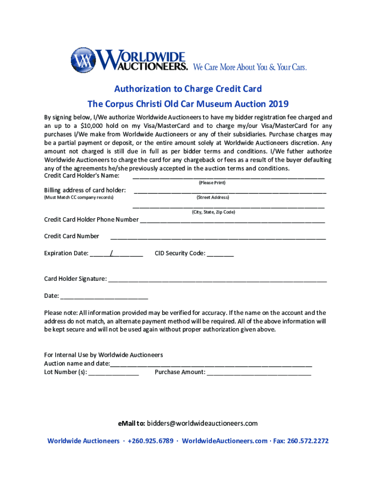 We Care More About You & Your Cars. Authorization to Charge Credit Card The Corpus Christi Old Car Museum Auction 2019 By signing below, I/We authorize Worldwide Auctioneers to have my bidder registration