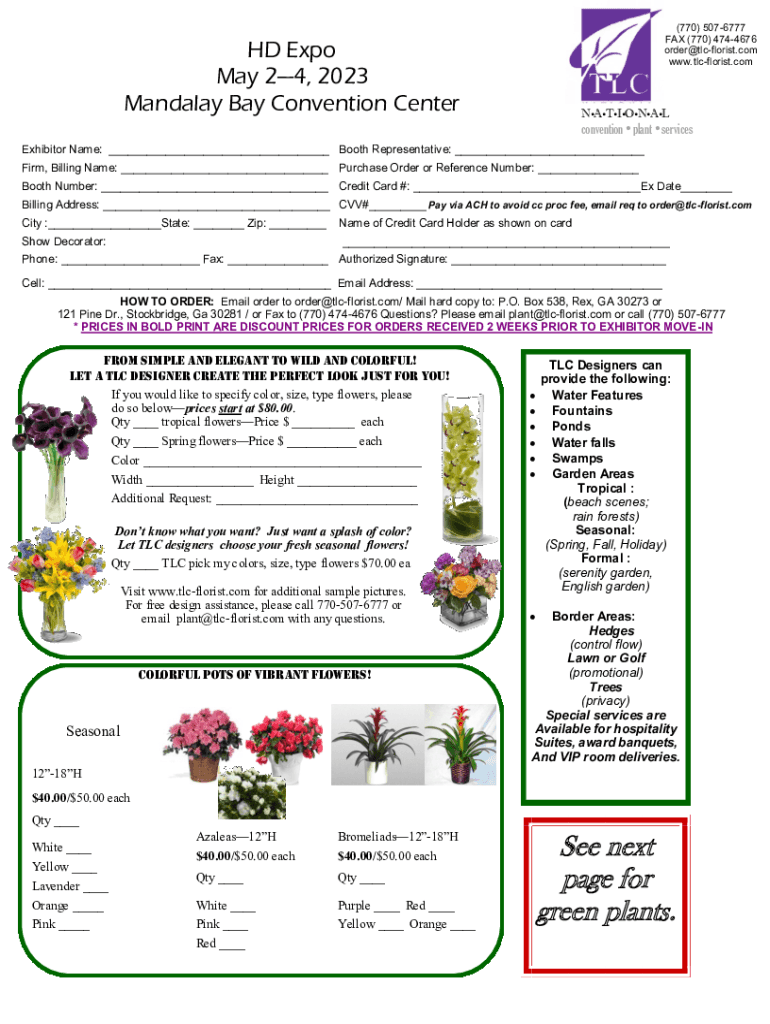 (770) 5076777 FAX (770) 4744676 order@tlcflorist.com www.tlcflorist.comHD Expo May 24, 2023, Mandalay Bay Convention CenterNATIONALconvention plant services Exhibitor Name: ___ Booth Representative: