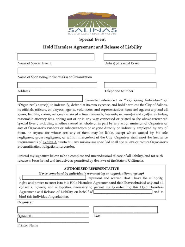Special Event Hold Harmless Agreement and Release of Liability ___ Name of Special Event___ Date(s) of Special Event___ Name of Sponsoring Individual(s) or Organization ___ Address___ Telephone Number___