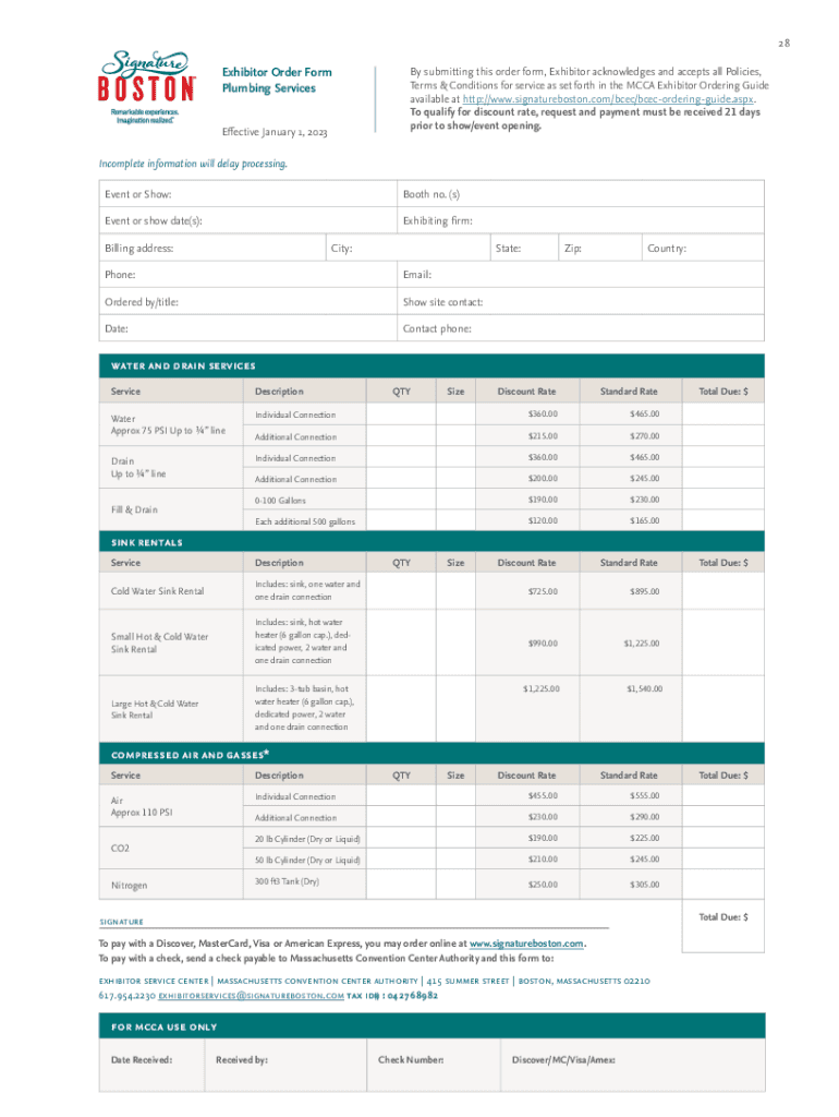 28Exhibitor Order Form Plumbing Services submitting this order form, Exhibitor acknowledges and accepts all Policies, Terms & Conditions for service as set forth in the MECCA Exhibitor Ordering Guide