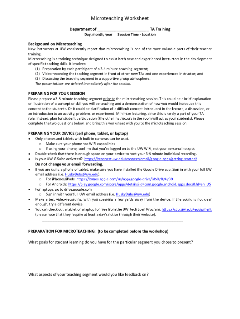 Microteaching Worksheet Department of ___ TA Training Day, month, year | Session Time LocationBackground on Microteaching instructors at UW consistently report that microteaching is one of the most