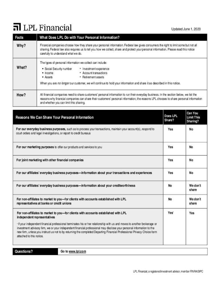 Updated June 1, 2020Facts Why? What? What Does LPL Do with Your Personal Information? Financial companies choose how they share your personal information. Federal law gives consumers the right to