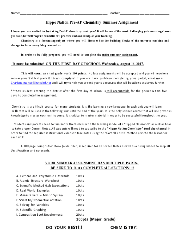 Name:___Teacher___Hippo Nation Prep Chemistry Summer AssignmentIhopeyouareexcitedtobe taking PreAPchemistrynextyear! It will be one of the most challenging yet rewarding classes