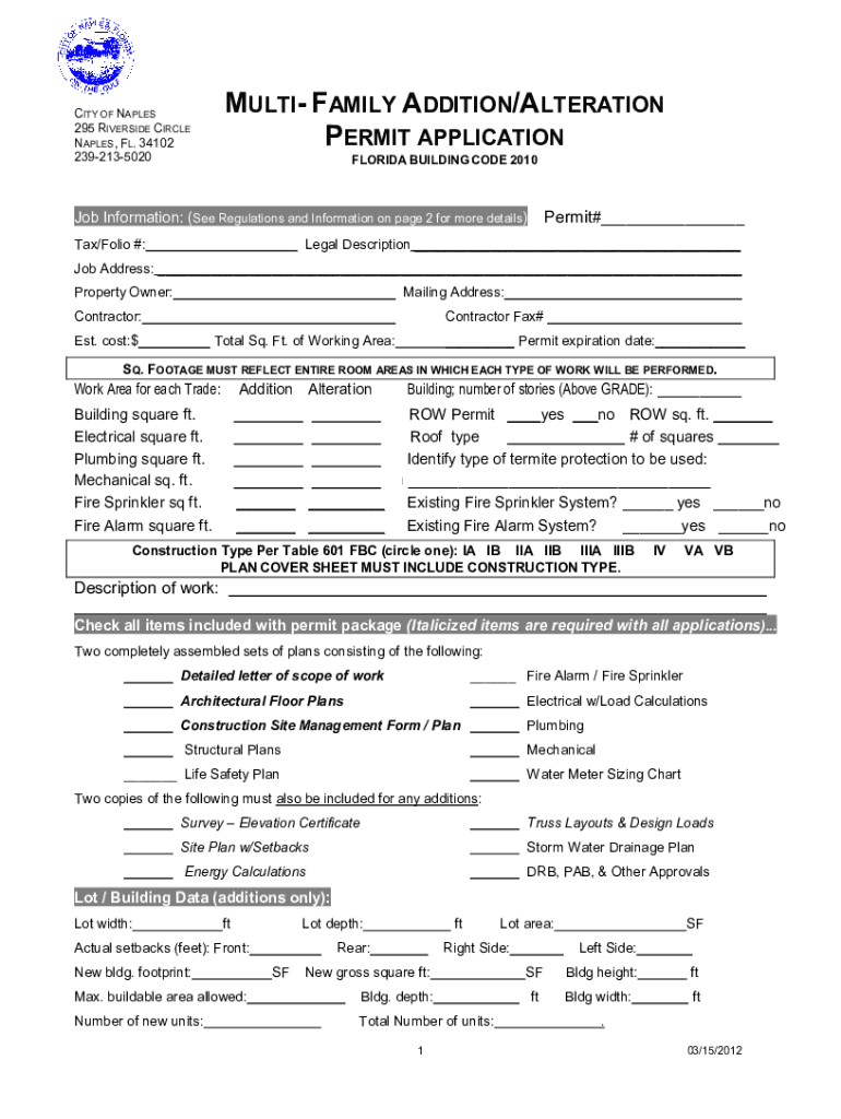 MULTI FAMILY ADDITION/ALTERATION PERMIT APPLICATIONCITY OF NAPLES 295 RIVERSIDE CIRCLE NAPLES, FL. 34102 2392135020FLORIDA BUILDING CODE 2010Permit#___Job Information: (See Regulations and Information