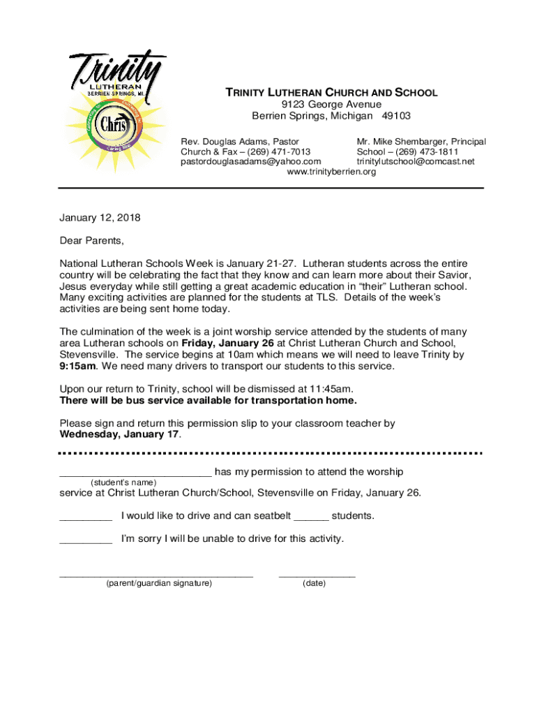 TRINITY LUTHERAN CHURCH AND SCHOOL 9123 George Avenue Berries Springs, Michigan 49103 Rev. Douglas Adams, Pastor Mr. Mike Hamburger, Principal Church & Fax (269) 4717013 School (269) 4731811 pastordouglasadams@yahoo.com