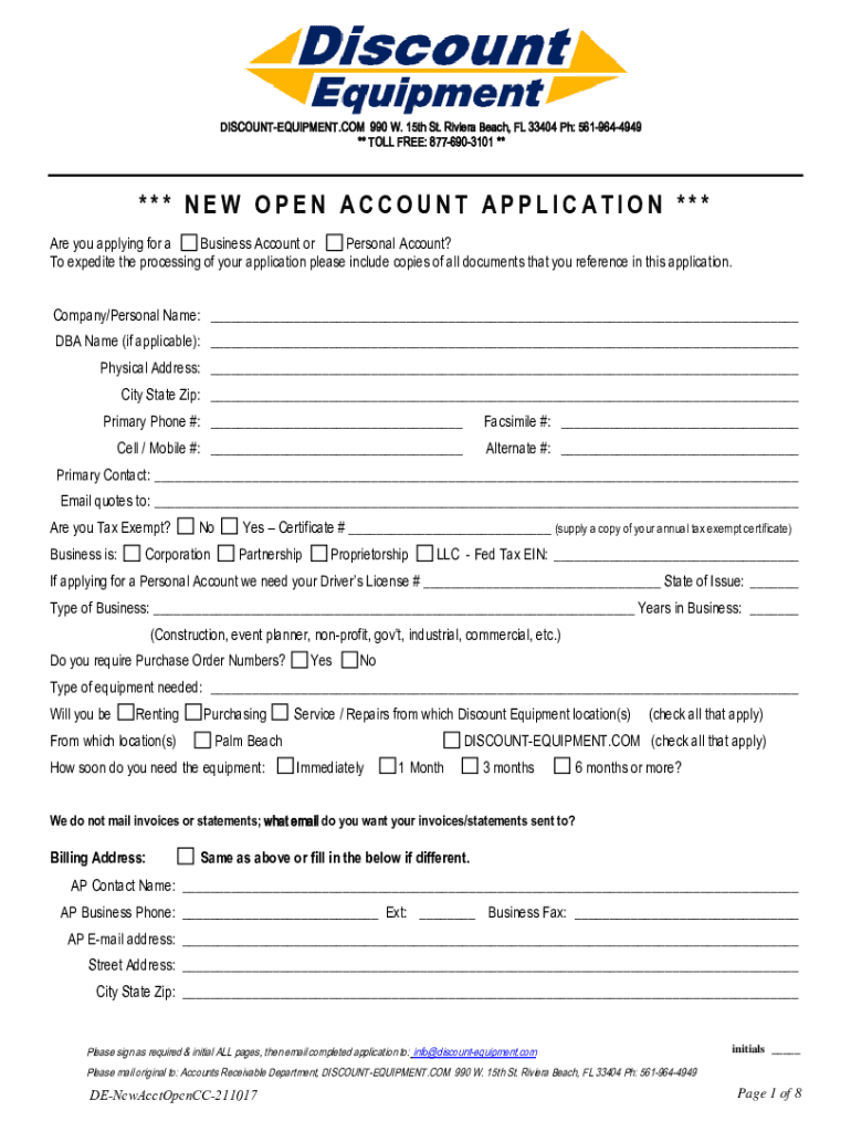 DISCOUNTEQUIPMENT.COM 990 W. 15th St. Riviera Beach, FL 33404 pH: 5619644949 ** TOLL FREE: 8776903101 ***** NEW OPEN ACCOUNT APPLICATION *** Are you applying for a Business Account or Personal Account?