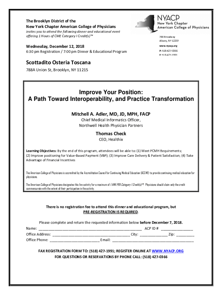 The Brooklyn District of the New York Chapter American College of Physicians invites you to attend the following dinner and educational event offering 1 Hours of CME Category I Credit(s)744 Broadway