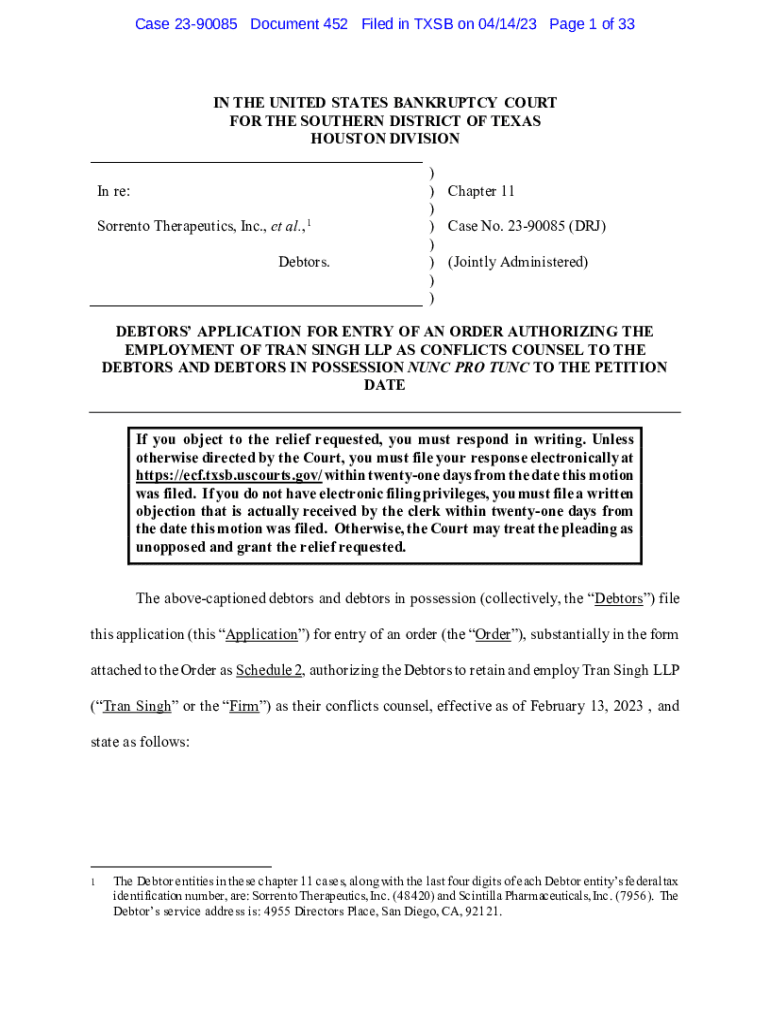 Case 2390085 Document 452 Filed in TSB on 04/14/23-Page 1 of 33IN THE UNITED STATES BANKRUPTCY COURT FOR THE SOUTHERN DISTRICT OF TEXAS HOUSTON DIVISION In re: Sorrento Therapeutics, Inc., et al.,
