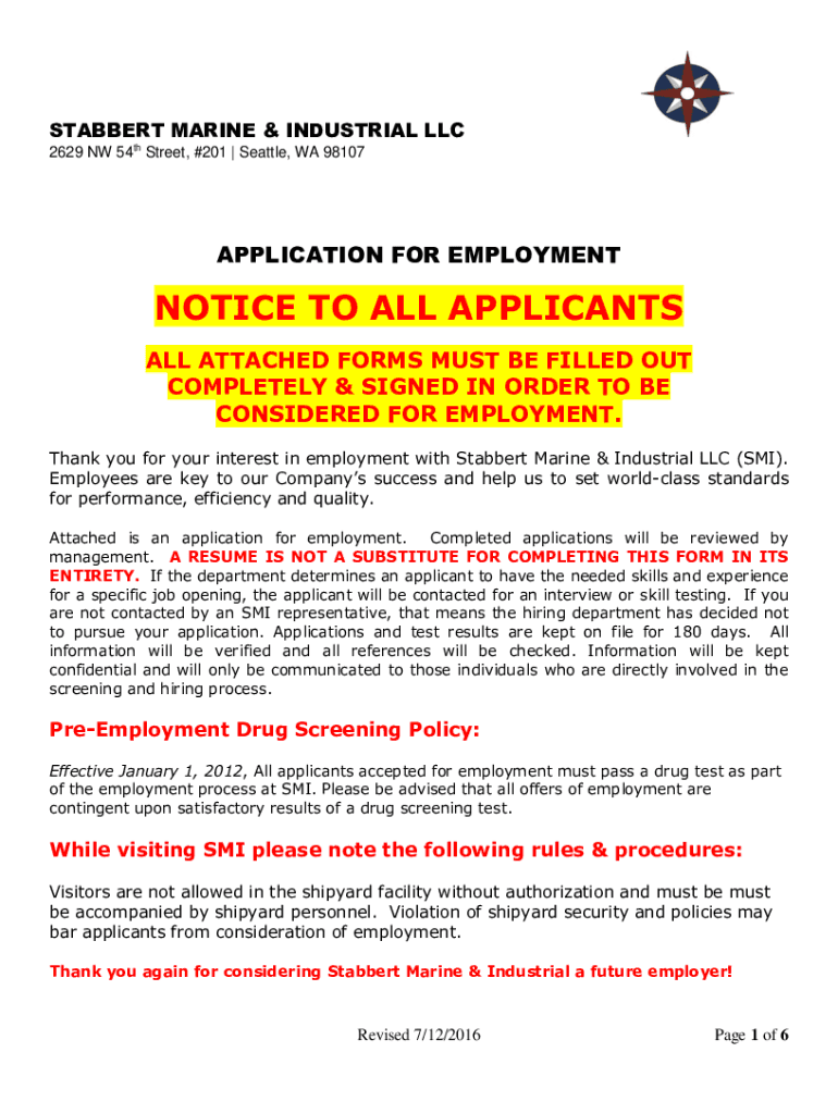 STABBER MARINE & INDUSTRIAL LLC 2629 NW 54th Street, #201 | Seattle, WA 98107APPLICATION FOR EMPLOYMENTNOTICE TO ALL APPLICANTS ALL ATTACHED FORMS MUST BE FILLED OUT COMPLETELY & SIGNED IN ORDER TO