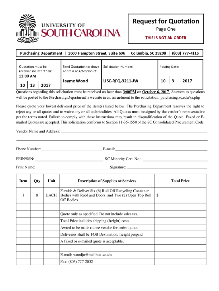 Request for Quotation Page One THIS IS NOT AN ORDER Purchasing Department | 1600 Hampton Street, Suite 606 | Columbia, SC 29208 | (803) 7774115 Quotation must be received no later than:Send Quotation
