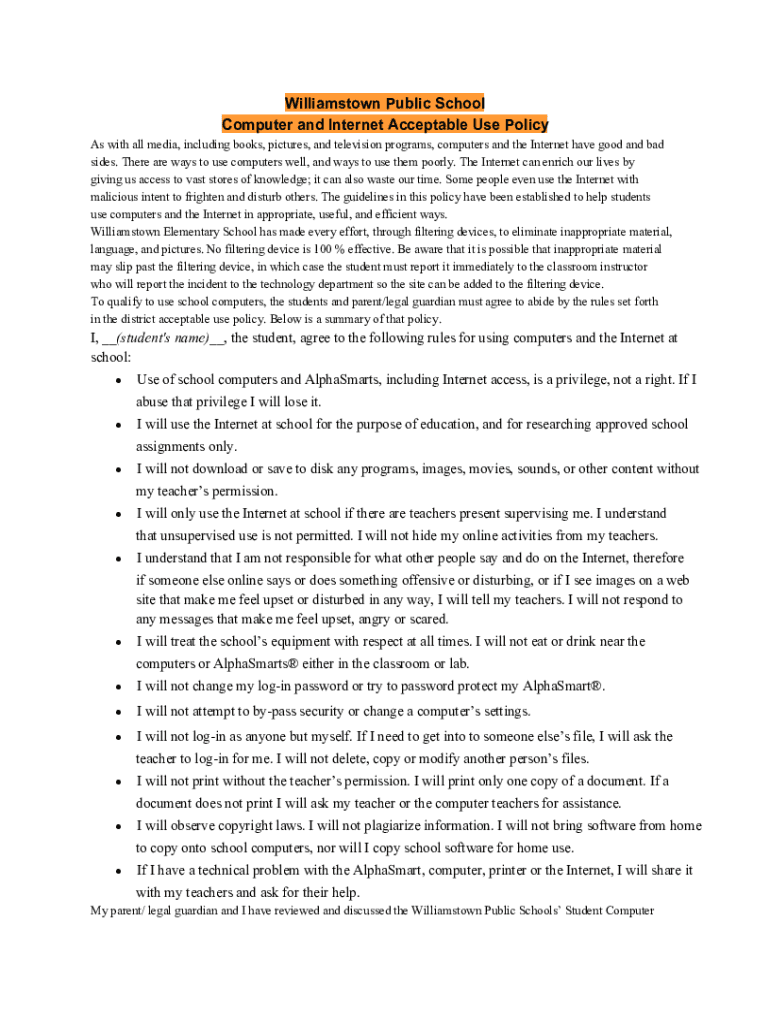 WilliamstownPublicSchool ComputerandInternetAcceptableUsePolicy Aswithallmedia, including books, pictures, andtelevisionprograms, computersandtheInternethavegoodandbad sides. Therearewaystousecomputerswell,