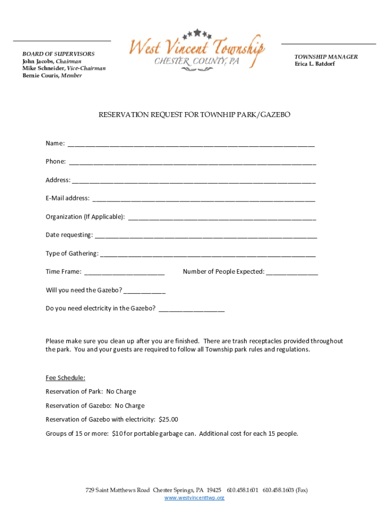 Get the free RESERVATION REQUEST FOR TOWNHIP PARK/GAZEBO Name ...
