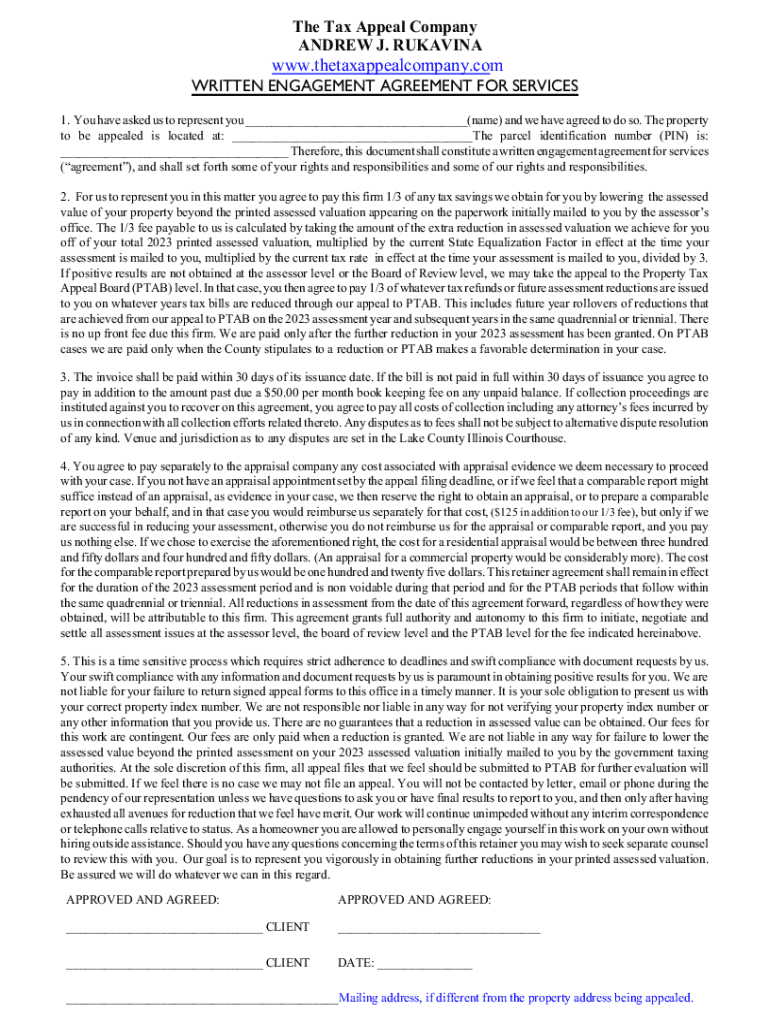 The Tax Appeal Company ANDREW J. RUKAVINAwww.thetaxappealcompany.com WRITTEN ENGAGEMENT AGREEMENT FOR SERVICES 1. You have asked us to represent you ___(name) and we have agreed to do so. The property
