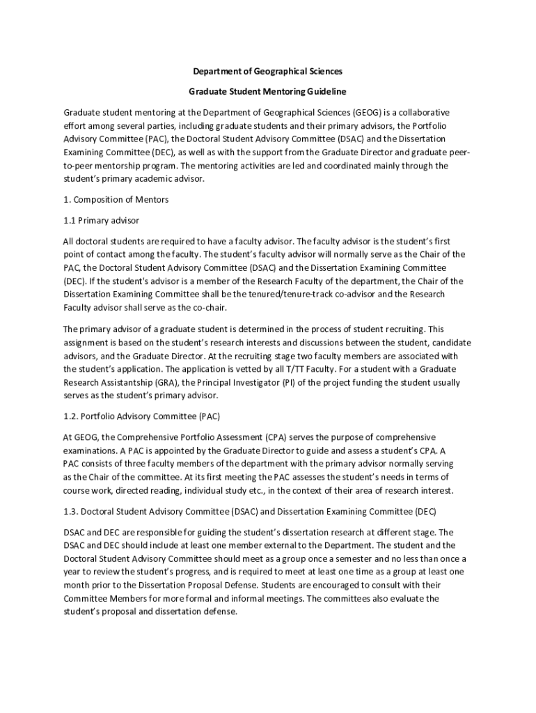 Department of Geographical Sciences Graduate Student Mentoring Guideline Graduate student mentoring at the Department of Geographical Sciences (GEOG) is a collaborative effort among several parties,