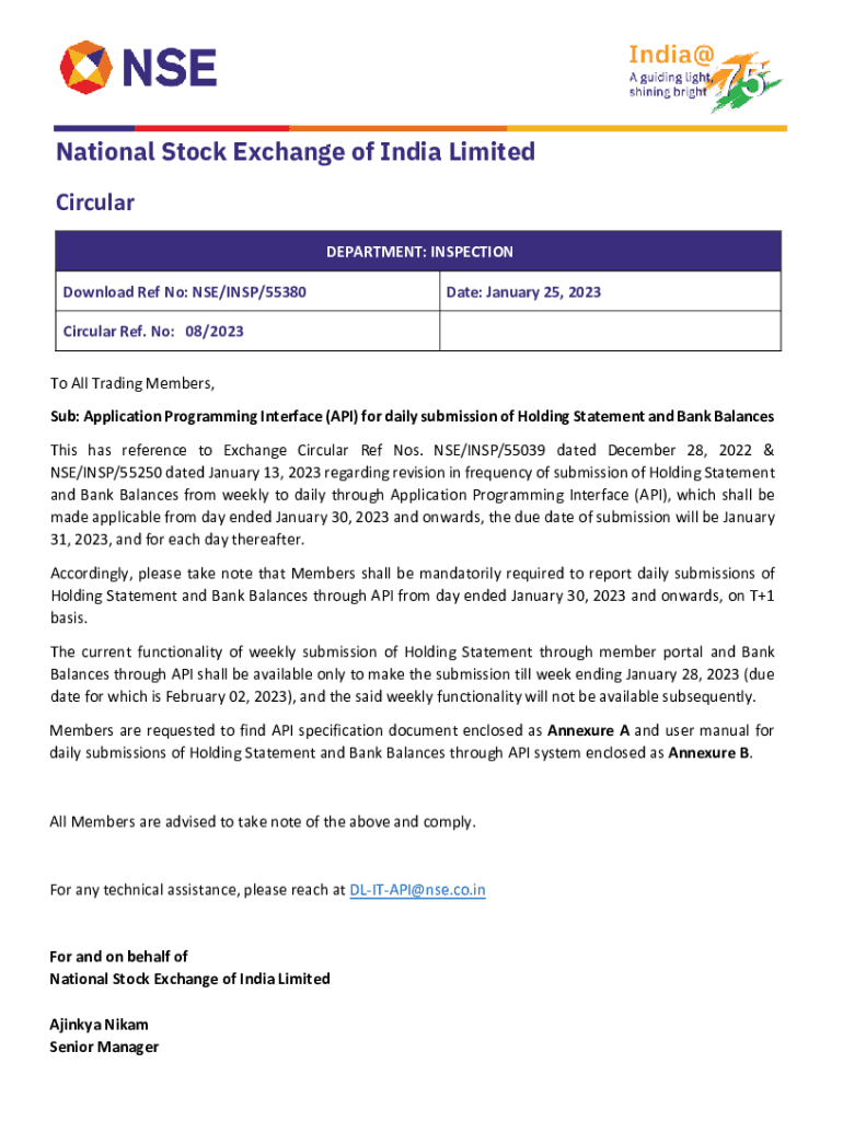 National Stock Exchange of India Limited Circular DEPARTMENT: INSPECTION Download Ref No: USE/INSP/55380Date: January 25, 2023Circular Ref. No: 08/2023 To All Trading Members, Sub: Application Programming