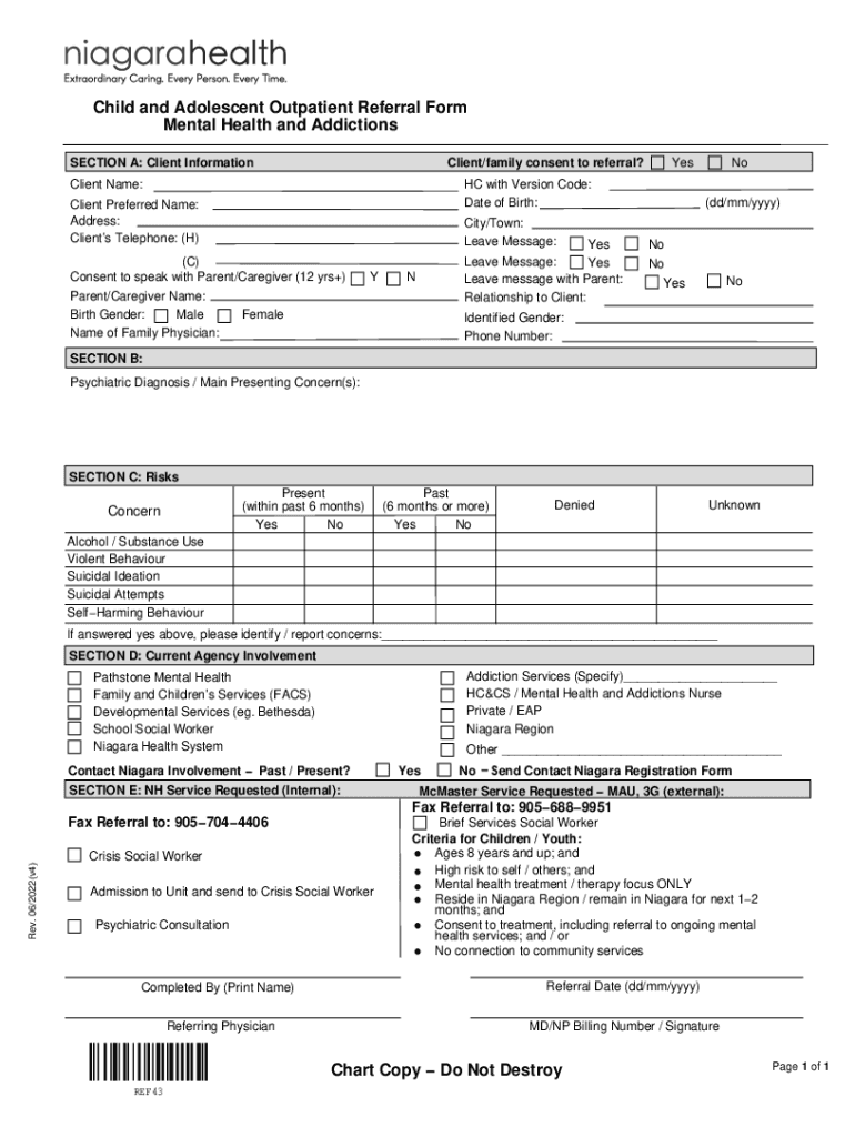 Child and Adolescent Outpatient Referral Form Mental Health and Addictions SECTION A: Client InformationClient/family consent to referral? Client Name:Yes with Version Code: Date of Birth:Client Preferred