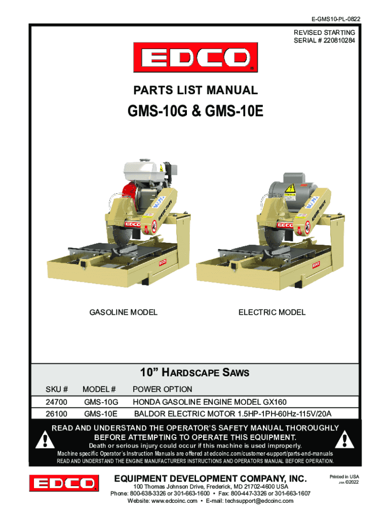 SERIAL # 220810284PARTS LIST MANUALGMS10G & GMS10EGASOLINE MODELELECTRIC MODEL10 HARDSCAPE SAWS