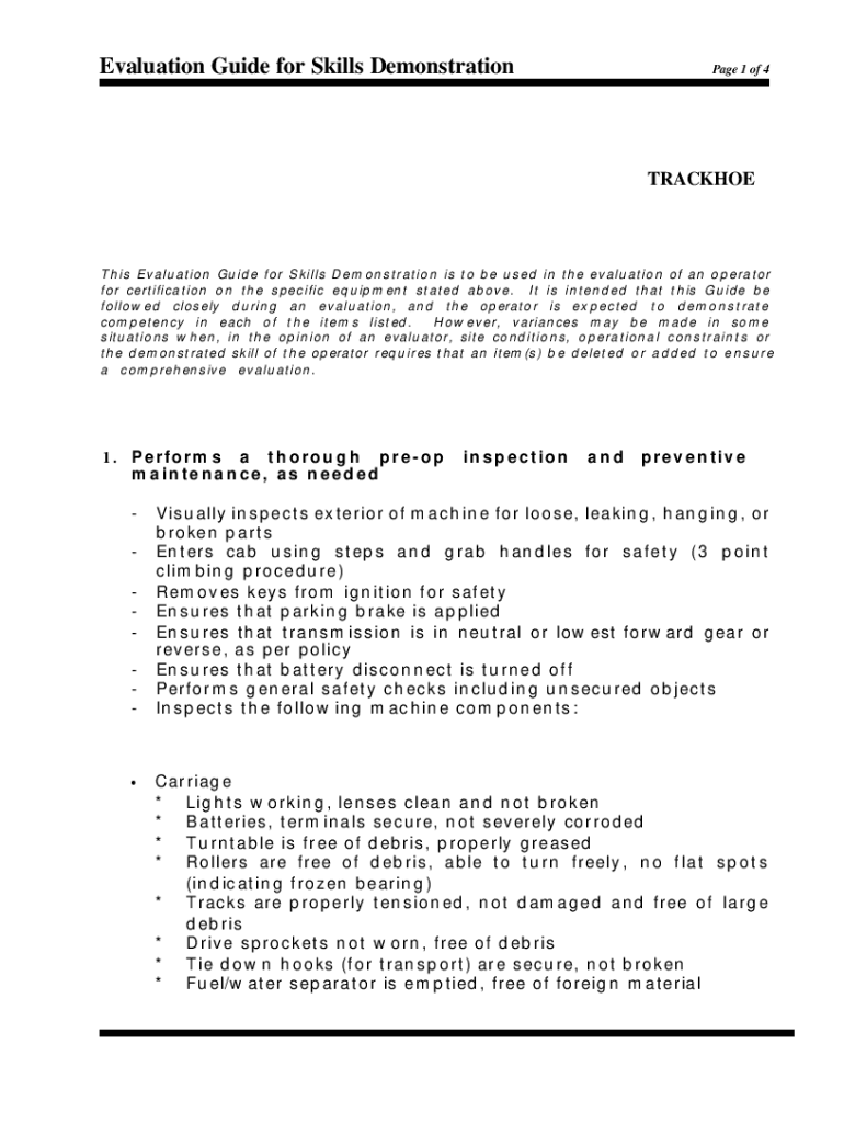 Evaluation Guide for Skills Demonstration Page 1 of 4TRACKHOEThis Evaluation Guide for Skills Demonstration is to be used in the evaluation of an operator for certification on the specific equipment