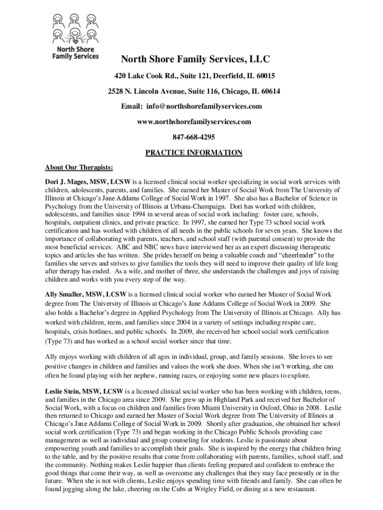 North Shore Family Services, LLC 420 Lake Cook Rd., Suite 121, Deerfield, IL 60015 2528 N. Lincoln Avenue, Suite 116, Chicago, IL 60614 Email: info@northshorefamilyservices.com www.northshorefamilyservices.com