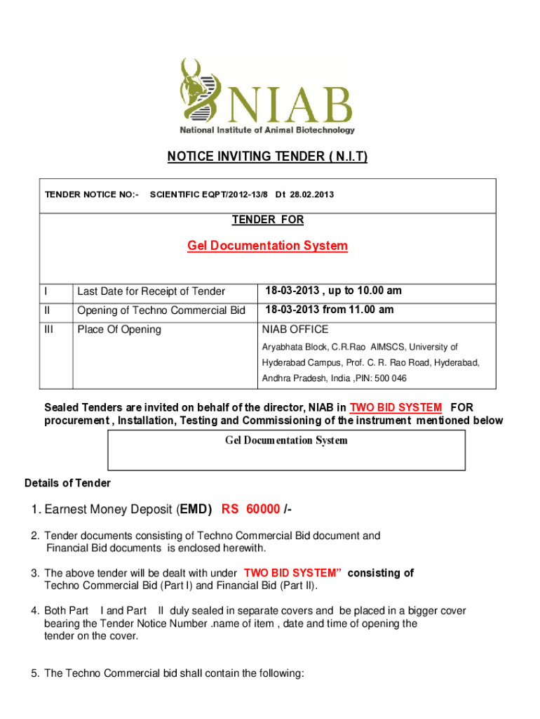 Get the free NOTICE INVITING TENDER ( N.I.T) Gel Documentation ...