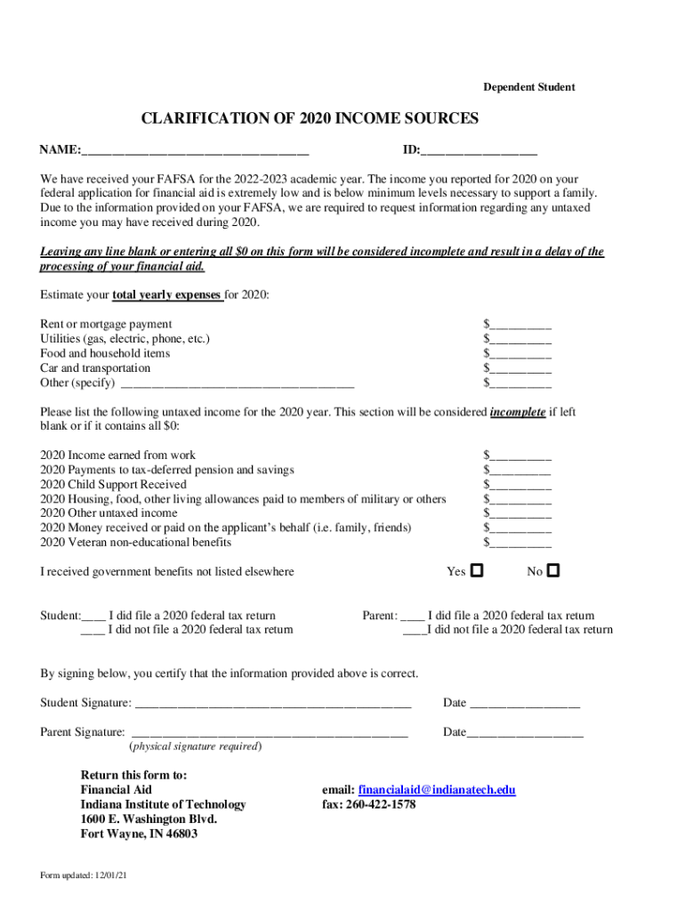 Dependent StudentCLARIFICATION OF 2020 INCOME SOURCES NAME:___ID:___We have received your FAFSA for the 20222023 academic year. The income you reported for 2020 on your federal application for financial