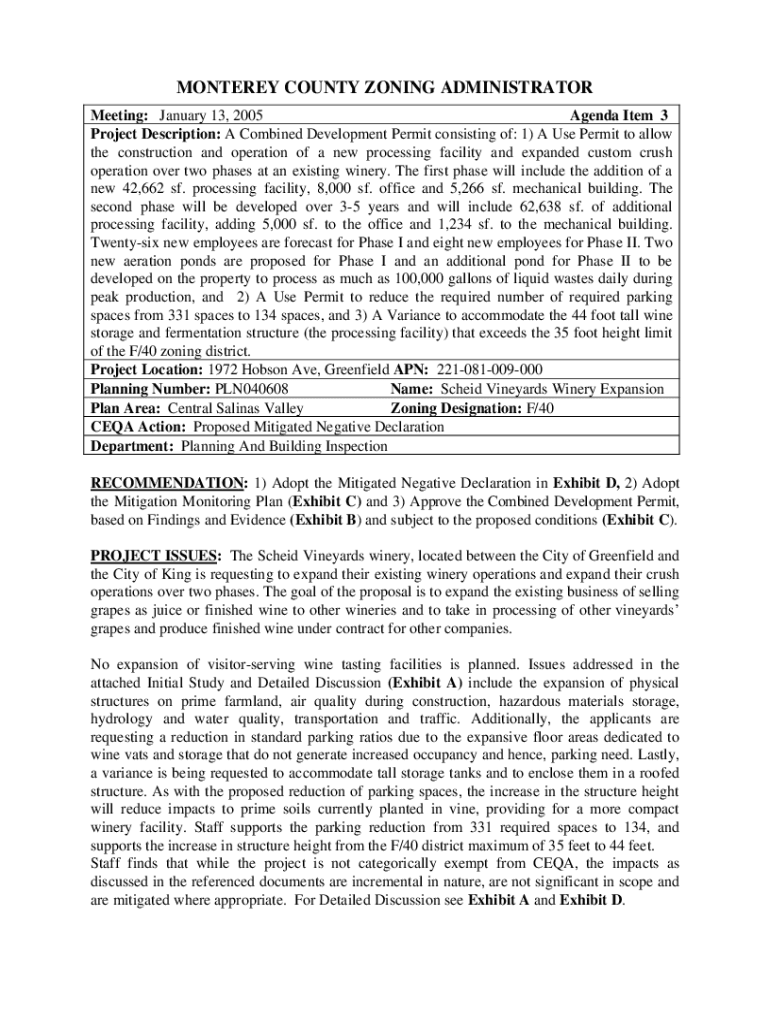 MONTEREY COUNTY ZONING ADMINISTRATOR Meeting: January 13, 2005, Agenda Item 3 Project Description: A Combined Development Permit consisting of: 1) A Use Permit to allow the construction and operation