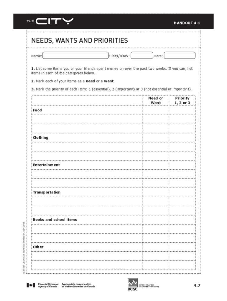 Get the free Needs and Wants Worksheet.docx