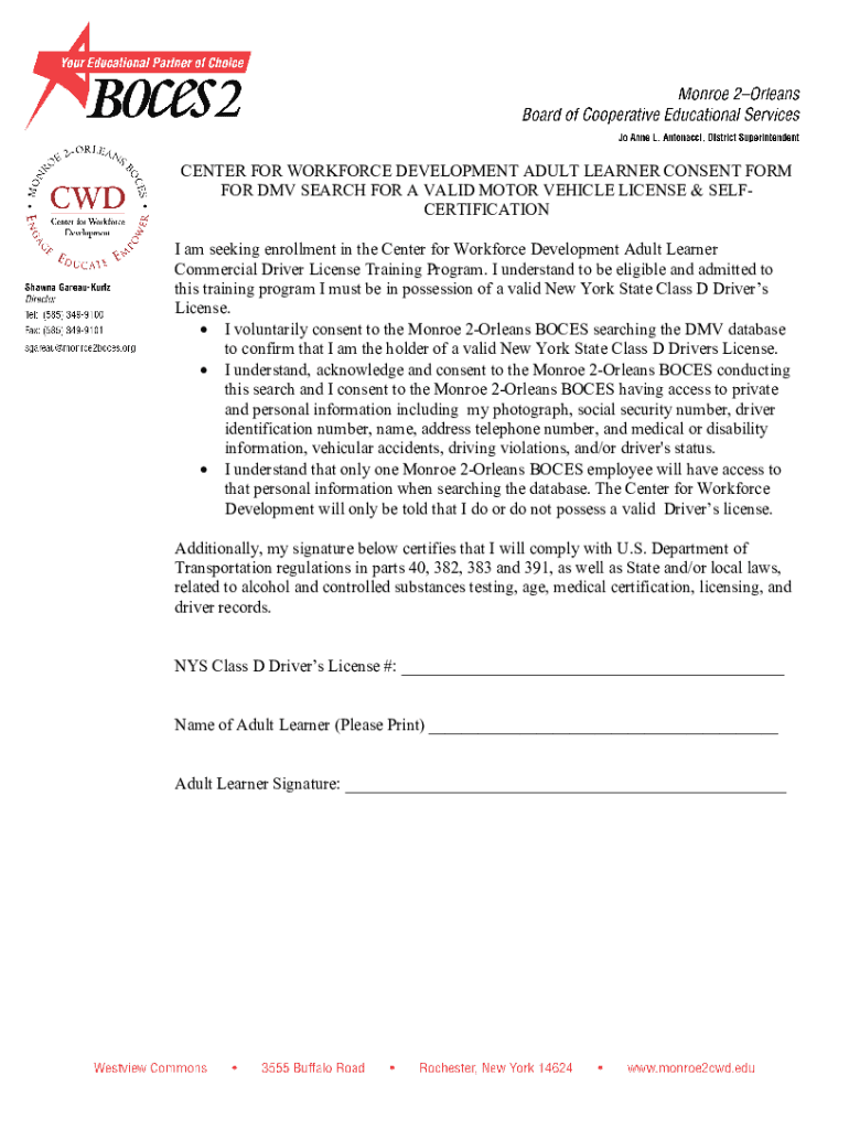 CENTER FOR WORKFORCE DEVELOPMENT ADULT LEARNER CONSENT FORM FOR DMV SEARCH FOR A VALID MOTOR VEHICLE LICENSE & RECERTIFICATION I am seeking enrollment in the Center for Workforce Development Adult