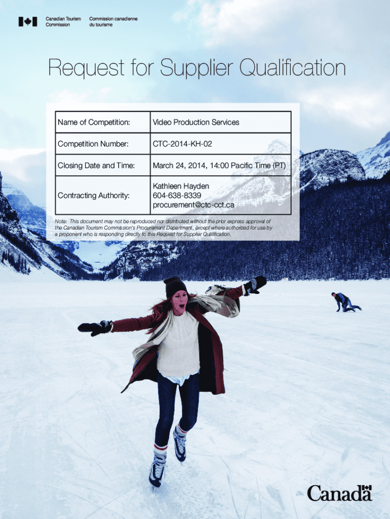 Request for Supplier Qualification Name of Competition:Video Production ServicesCompetition Number:CTC2014KH02Closing Date and Time:March 24, 2014, 14:00 Pacific Time (PT)Contracting Authority:Kathleen