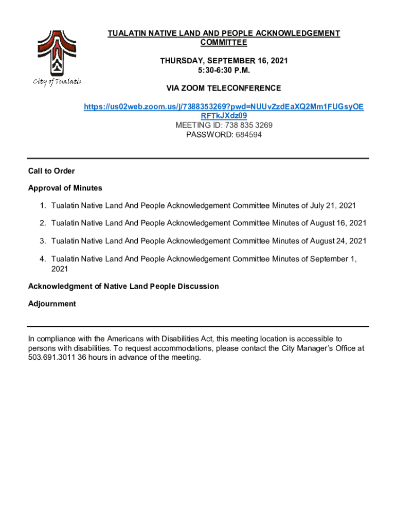 TUALATIN NATIVE LAND AND PEOPLE ACKNOWLEDGEMENT COMMITTEE THURSDAY, SEPTEMBER 16, 2021 5:306:30 P.M. VIA ZOOM TELECONFERENCE https://us02web.zoom.us/j/7388353269?pwdNUUvZzdEaXQ2Mm1FUGsyOE RFTkJXdz09