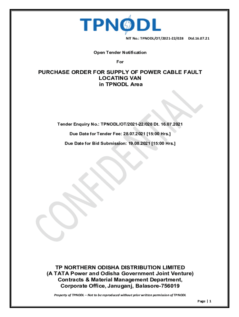NIT No.: TEND/OT/202122/028Dtd.16.07.21Open Tender Notification Purchase ORDER FOR SUPPLY OF POWER CABLE FAULT LOCATING VAN in TEND Pretender Inquiry No.: TEND/OT/202122/028 DT. 16.07.2021 Due Date