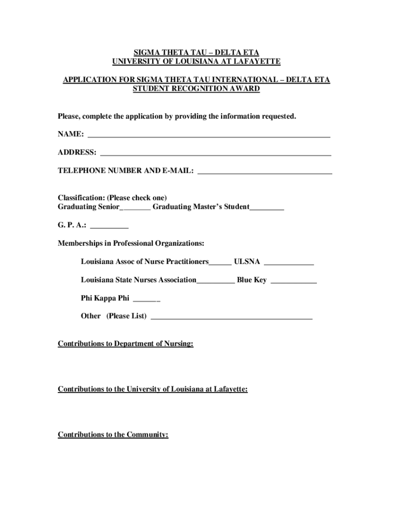 SIGMA THETA TAU DELTA ETA UNIVERSITY OF LOUISIANA AT LAFAYETTE APPLICATION FOR SIGMA THETA TAU INTERNATIONAL DELTA ETA STUDENT RECOGNITION AWARDPlease, complete the application by providing the information