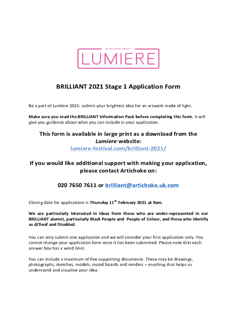 BRILLIANT 2021 Stage 1 Application Form Be a part of Lumiere 2021: submit your brightest idea for an artwork made of light. Make sure you read the BRILLIANT Information Pack before completing this