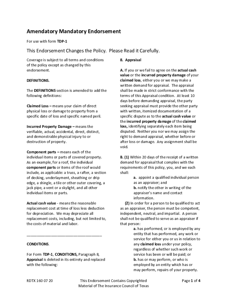 Amendatory Mandatory Endorsement For use with form TDP1This Endorsement Changes the Policy. Please Read it Carefully. Coverage is subject to all terms and conditions of the policy except as changed
