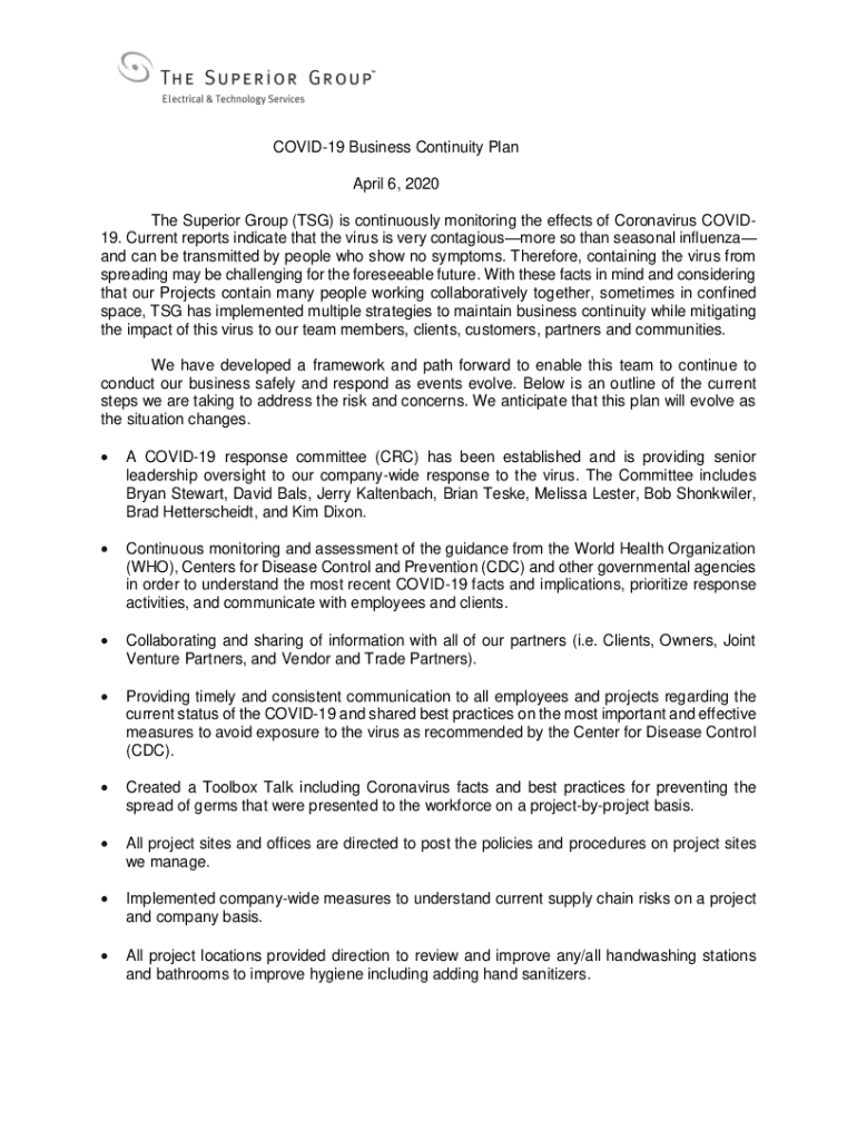 COVID-19 Business Continuity Plan April 6, 2020, The Superior Group (TSG) is continuously monitoring the effects of Coronavirus COVID-19. Current reports indicate that the virus is very contagious