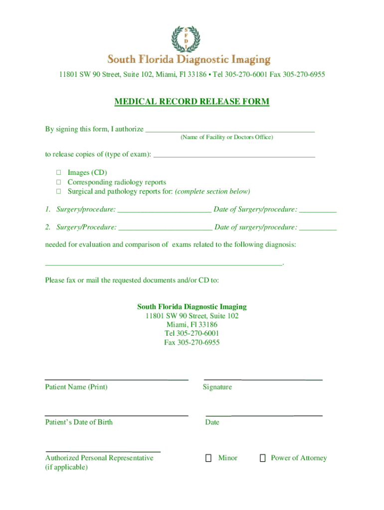 11801 SW 90 Street, Suite 102, Miami, Fl 33186 Tel 3052706001 Fax 3052706955MEDICAL RECORD RELEASE FORM By signing this form, I authorize ___ (Name of Facility or Doctor's Office)to release copies